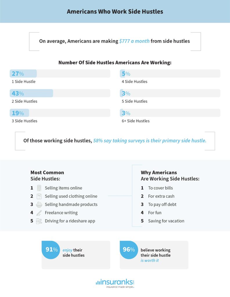 When we took a closer look at working Americans with a side hustle, we found that on average, Americans are banking $777 a month from that hustle. Even if they aren’t working one of the side hustles that pay weekly, the additional monthly income can be helpful.