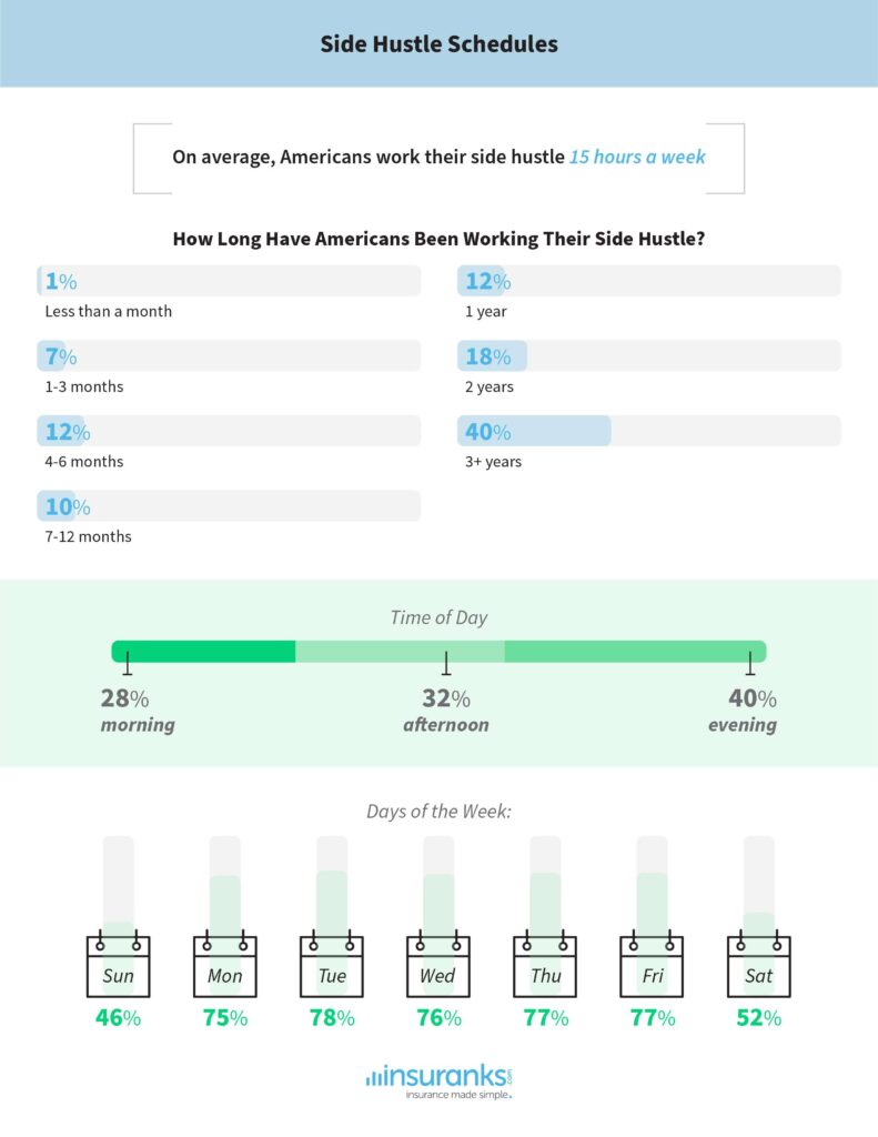 On average, Americans are working their side hustles 15 hours a week, and it’s a pretty even split between mornings, afternoons, and nights. Many Americans are working their side jobs all days of the week, but primarily they’re working Monday through Friday.