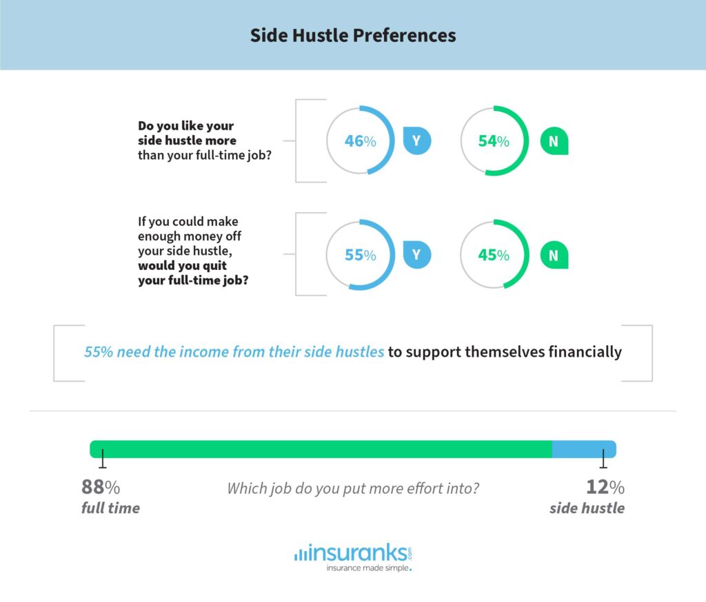 At the end of the day, which do Americans prefer? More than half do not enjoy their side hustle more than their full-time job, but if given the chance, 55% would quit their full-time job if they made enough money solely working their side hustle.