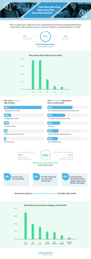 In May 2022, we surveyed 1,006 full-time and part-time Americans workers about their side hustles and income. Respondents were 49% female, 49% male, and 2% transgender/non-binary. The age range was 18 to 84, with an average age of 37 years old.